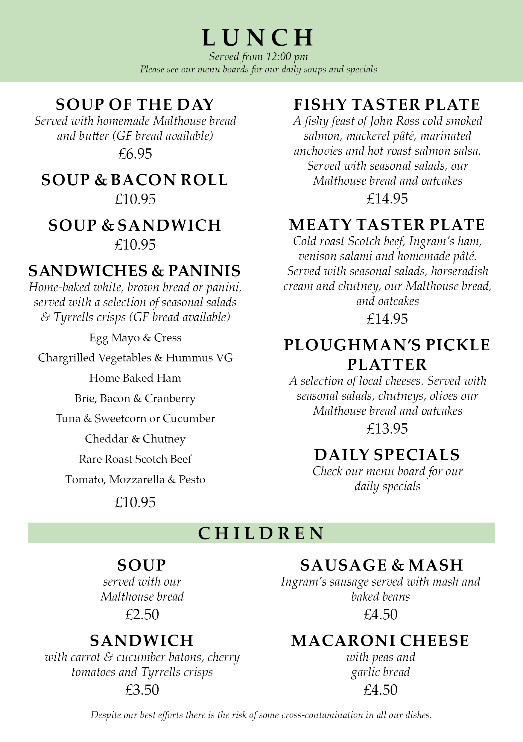Cold roast Scotch beef, Ingram’s ham, venison salami and homemade pâté. Served with seasonal salads, horseradish cream and chutney, our Malthouse bread, and oatcakes