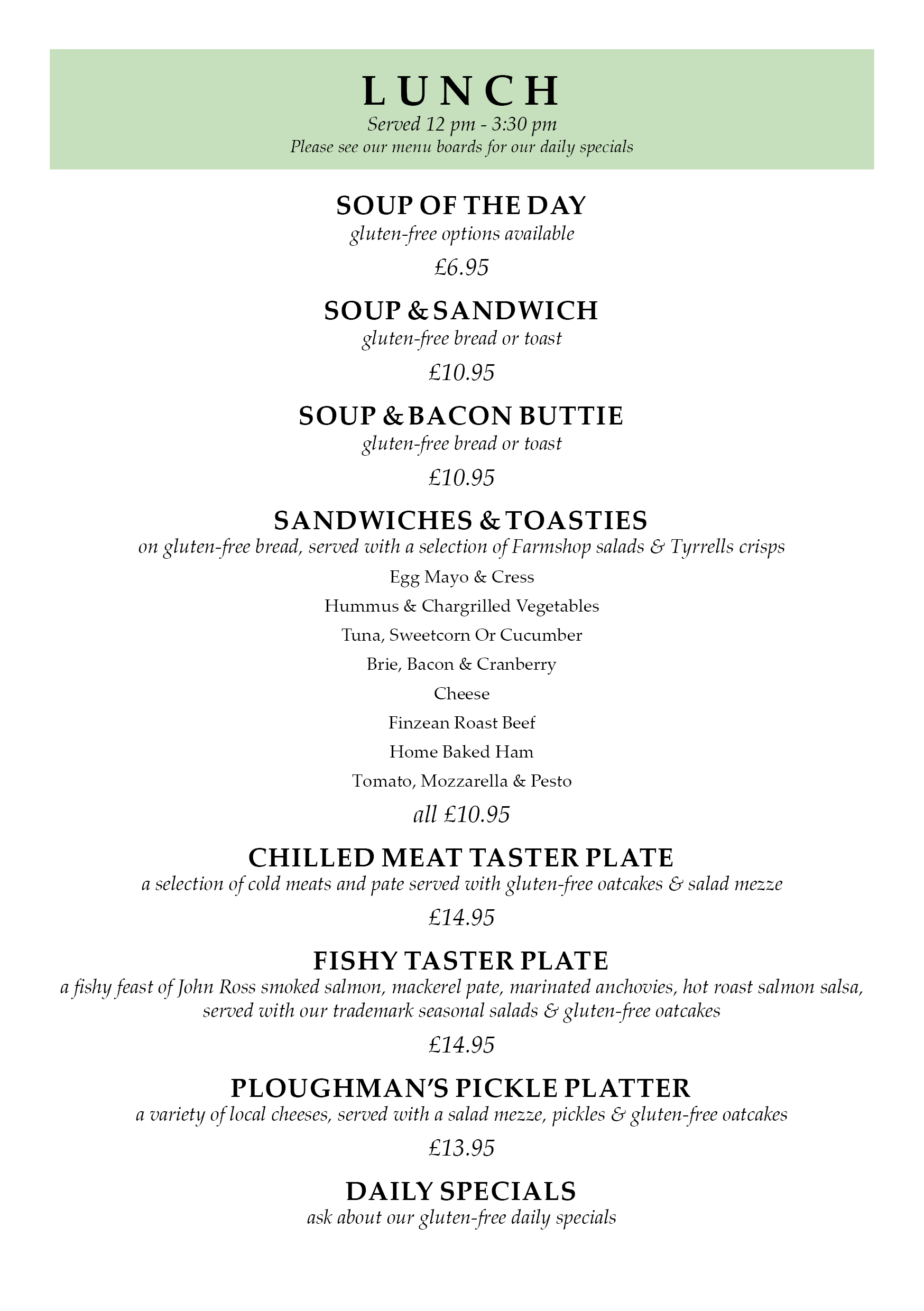 - Ploughman’s Pickle Platter - a variety of local cheeses, served with a salad mezze, pickles & gluten-free oatcakes