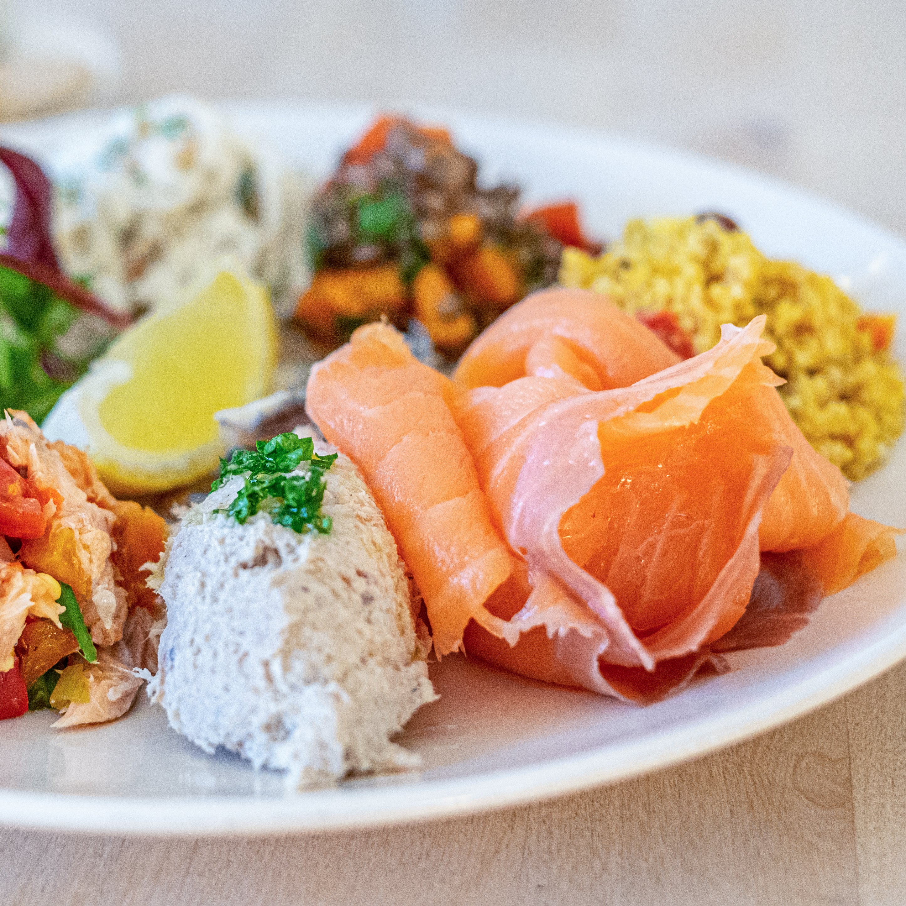 - Fishy Taster Plate - a fishy feast of John Ross smoked salmon, mackerel pate, marinated anchovies, hot roast salmon salsa, served with our trademark seasonal salads & gluten-free oatcakes