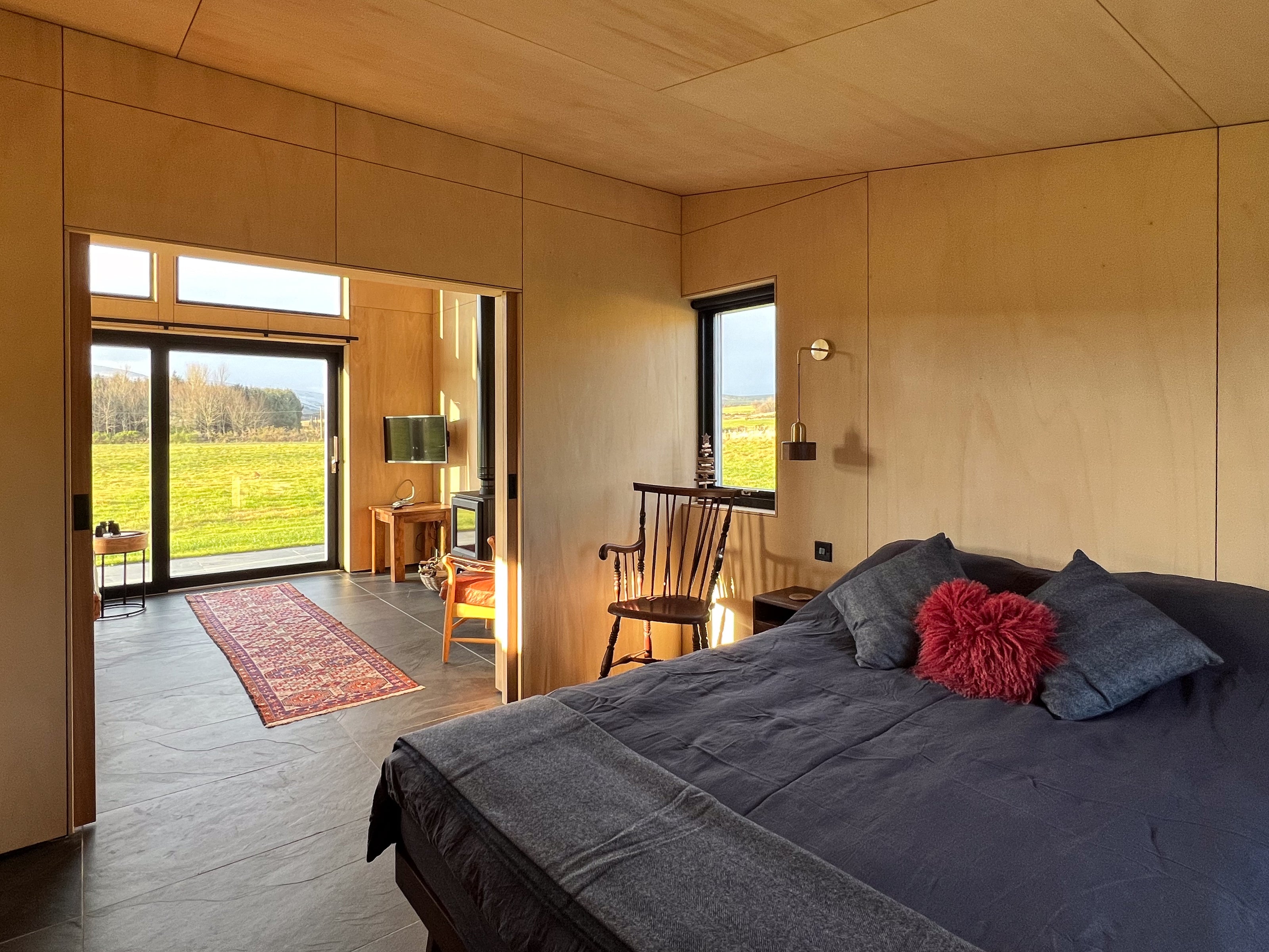 It isn’t all about the outside though! Receive a cosy hug when you enter with the underfloor air source heating warming the entire slate tile flooring and feel welcomingly cocooned by the mellow plywood work-of-art interior.