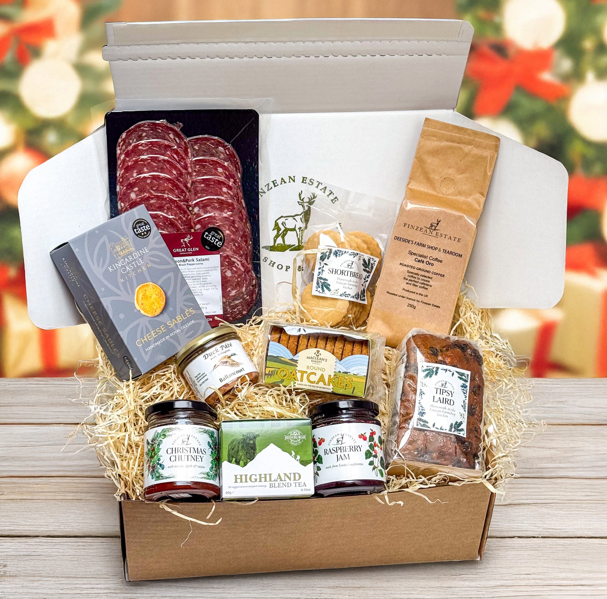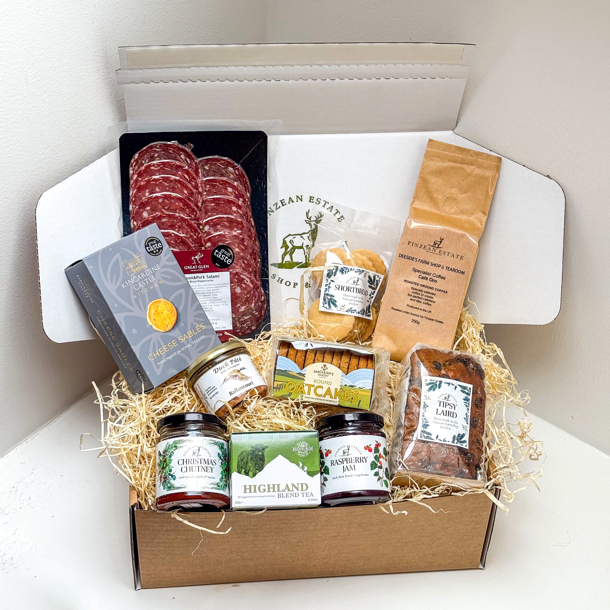 Our Finzean hampers are full of homemade and local products make a great gift. The hampers are available for UK delivery or collection from the shop. Choose from a Finzean Box or a Finzean Jute Bag. Cellophane Wrapping and Wicker Baskets are also available for an extra charge.
